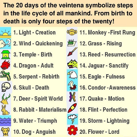 Table 1 shows the 20 day signs of Native American Sacred Round, sometimes called the Eternal Round. They form a 20-day cycle which repeats continuously. The days represent 20 steps in the progression of mankind. The first six steps go from conception (Creation) to death (Skull). They can be applied to other things which have a "life". For example, as mentioned above, the first seven steps were apparently applied to the "life" of the gold plates, which were "born" when they came from the ground and "died" when they were reburied.