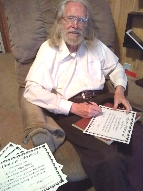 The first public meeting of the new branch of the Church convened at 10:00 am MST at Ed and Jeanne's home in Duchesne, Utah, on Easter Sunday, 12 Apr 2020. There were seven who had been baptized yesterday in attendance, Russell having left for home on Saturday afternoon. The first order of business was for me to confirm by the laying on hands all who had been baptized to be members of the Church. For the two men who were to be ordained elders, Ed and Jim, that was done immediately after they were confirmed, in the same instance of laying on hands. In the case of Ed, it was not necessary to confer the higher priesthood on him, as he had previously been ordained by the Three Nephites,[6] but only to ordain him to be an elder in the Church.