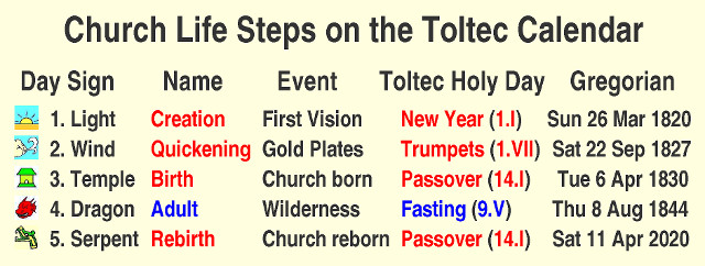 Joseph organized the Church on the day specified by the Lord, being Tue 6 Apr 1830. Subsequent research showed that it was the day to celebrate the birth of Jesus Christ in 1 BC.[8] Thu 6 Apr 1 BC was, however, also Passover on the Hebrew Calendar. For years it bothered me that Tue 6 Apr 1830 was not also the Hebrew Passover. Then last year in 2019 it was discovered that Tue 6 Apr 1830 was indeed Passover on the newly discovered Toltec Calendar.[9] That made sense as symbolic, because it was indeed a church of the Western Hemisphere, using a scripture book delivered by the Moroni, who was apparently a founder of the Toltecs.[10]