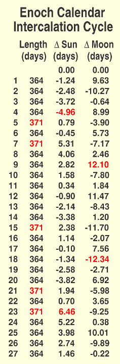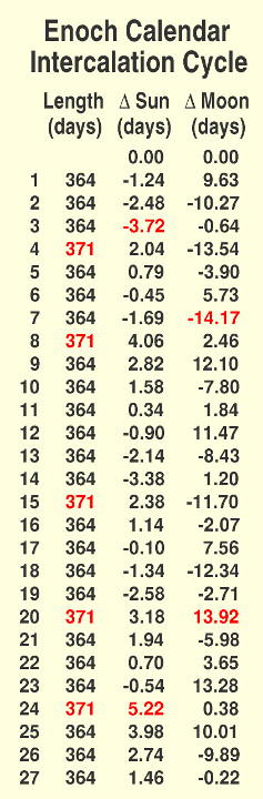 Now look at the bottom line of the table. After 27 years, the solar day is higher by 1.46 days and the lunar only about a fifth of a day short of being exactly new. That line partially fulfills Enoch's rule that a new moon (that year) should bring in the year exactly! As for the sun, if the cycle began on an Enoch Spring Equinox day on Sat 22 March, then the next 27-year cycle would begin on a Sat 23 or 24 March (1.46 days later). At the end of that second cycle, the sun is still within 2.92 (2 x 1.46) days of the beginning day, and the moon within -0.44 days. Because there is already a 9-day range for the Spring Equinox, this cycle can be repeated a third time. A third cycle would begin on Sat 25 March 2.92 days later on 25 March. In this manner, the table can be used for up to three cycles in a row, ending with a total error of 3 x 1.46 = 4.38 days. That means a fourth cycle would begin on either 26 or 27 March. If the were repeated much longer with no adjustment, the Enoch Spring Equinox would soon occur in April, beyond what is acceptable!