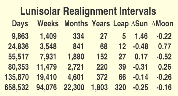 The way that most of the sacred calendars which need to intercalate function is that a cycle is used until it gets too far off and then it breaks somewhere and starts over. This is usually done in an elegant manner, meaning the smallest number of breaks or forming a larger pattern. Table 2 shows the units of time called "realignment intervals" when the average periods of the cycles of the sun and moon can both best be measured in weeks.[4]
