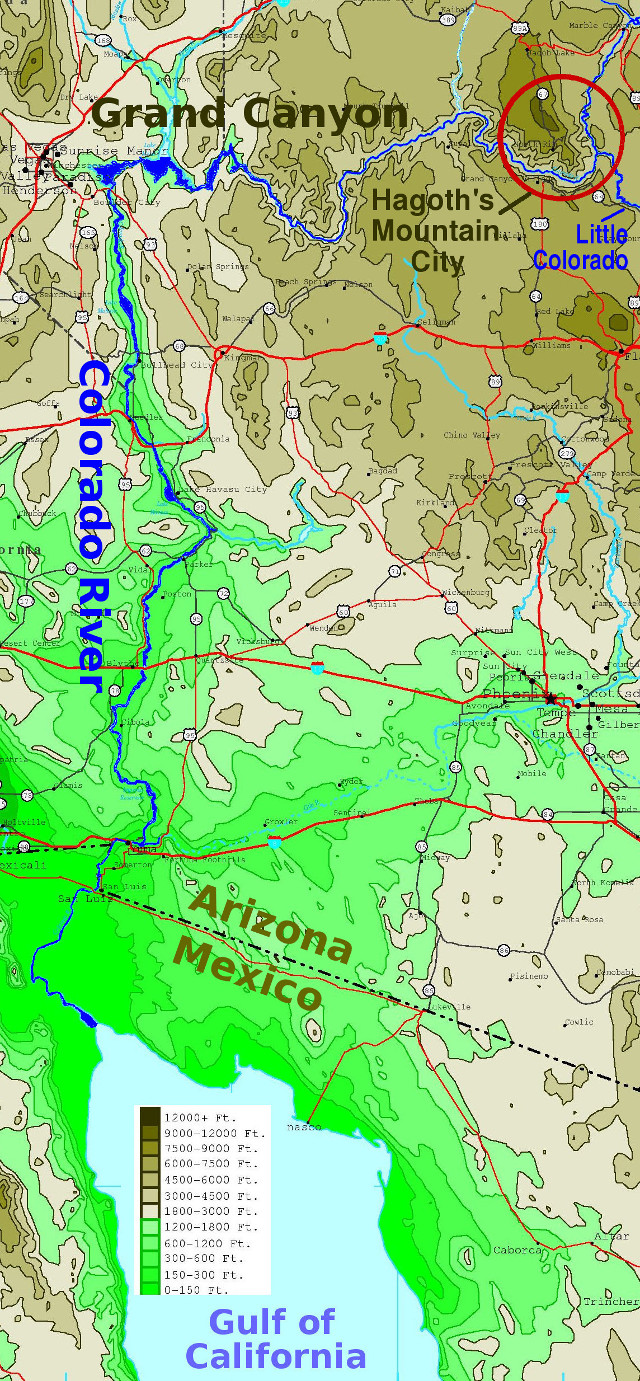 Moreover, the book explicitly states that Hagoth, being a ship builder and carpenter, was looking for a wooded area to build his city, so he could trade with those came the previous year who were building a city at the mouth of the Colorado. If this book is a fraud, those perpetrators were careful to note that the encircled area on the map contains much of the Kaibab National Forest (in high mountains -- altitude is indicated by the color) one would encounter going up the Colorado. Those who have been to the Grand Canyon via Jacob's Lake will be familiar with the lush forests there. He may have located his city at lower altitude, but access to the forests was close. It is proposed the it was located somewhere within the red circle. It is much easier to believe that the extremely self-consistent narrative in the Book of Hagoth is actually authentic than a fraud!