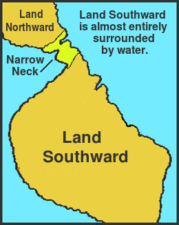 One of the most striking features of the landscape is that there is "a small neck of land" between the Land Northward and the Land Southward (v. 32). Almost all of the Book of Mormon narrative takes place in the Land Southward. The distance across the narrow neck is given as the distance a Nephite can cross in a day and a half.[7] The direction of the narrow neck is not specified, but only that it separates the Land Northward from the Land Southward.