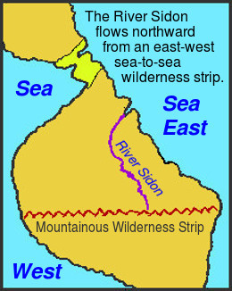 This tells us two things. First of all, the wilderness strip contains a mountain range because that is where the headwaters of large rivers are located. Secondly, it means that the River Sidon runs overall in a northerly direction, away from the east-west mountains and towards the sea. Both the mountainous wilderness strip and River Sidon are illustrated in the logical map in Figure 5.
