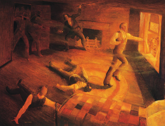 "While he was thus engaged, pouring out his bitter words upon me, a rabble rushed in and nearly filled the barn, drew out their knives, and began to quarrel among themselves for the premises, and for a moment forgot about me, at which time I took the opportunity to walk out of the barn about up to my ankles in mud.