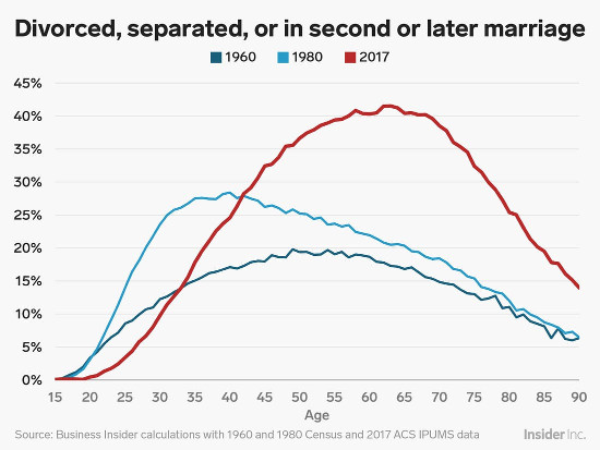 One reason for this increase in the divorce rate is that the concept of "no fault" divorces. Fifty years ago, divorce was illegal in some countries, or only granted in the case of adultery of the spouse. Now a couple merely has to say that they are "incompatible" and they are granted a divorce. It turns out that marriage is difficult for nearly everyone. The couple comes from different families and have different expectations for their spouse based on their previous family. Thus, divorce should be difficult to obtain, so that a couple is compelled to a degree to try to work out differences.