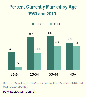 The graph here shows how much marriage has declined in the fifty years from 1960 to 2010. The percentage of young adults in the age range of 18 to 24 getting married dropped from 45% to 9% in those fifty years. Thus, only one fifth as many young adults are getting married young, and up to age 34 it is still only half as many! Now to that drastic decline, consider the rise in divorce rate on top of that!
