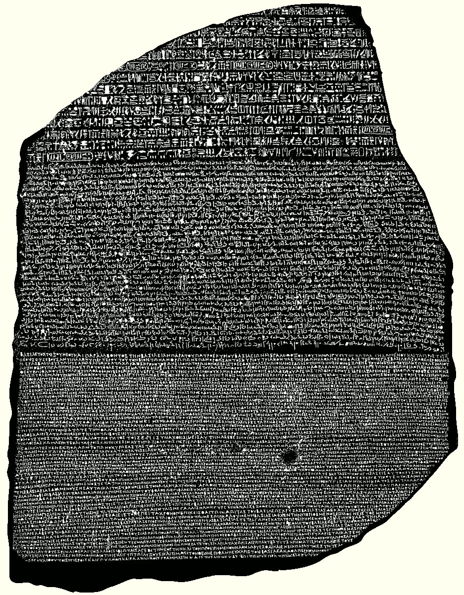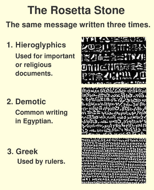 That stone was discovered in 1799 while Napoleon was conquering Egypt. As shown in the illustrations, it has three kinds of writing on it. The middle language was Egyptian demotic, which was the common language of the people back around the time of the beginning of the Christian era and which was rather well understood by scholars of the day. The bottom language was written in well-understood Greek. It was thus easy to see that both of the bottom two inscriptions were making the same declarations about the accomplishments of the Pharaoh of that time.[2]