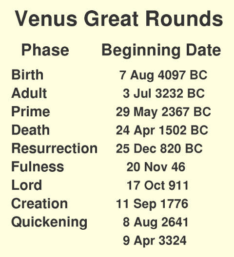 Table 3 shows the resultant divisions of our nine Great Rounds of history, viewed as phases one Venus Eternal Round. Notice that these divisions also testify of design: the entire Eternal Round begins just before Adam in the Birth phase, Jesus comes at the end of the Resurrection phase, the Christian Church begins in the Fulness phase, and that Church is restored near the beginning of the Creation phase. Finally, this Eternal Round ends just after the little season after the Millennium during which Satan is released. The divisions fit religious history extremely well!