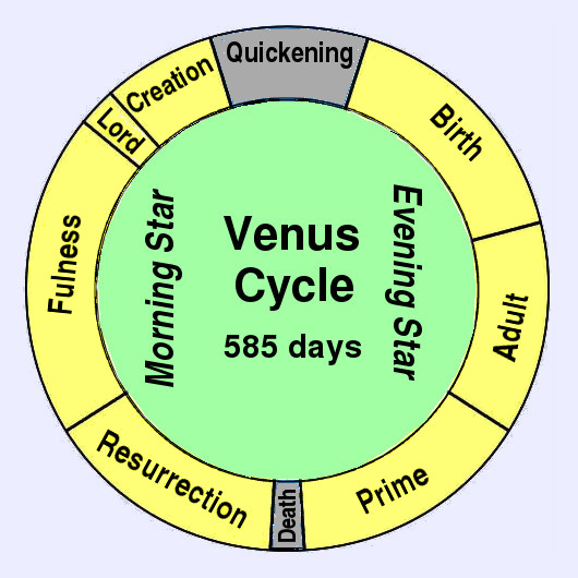 - At the bottom of the figure the numbers 236 + 90 + 250 + 8 = 584 represent the length of the visibility of Venus as the Morning Star (about 263 days) then its disappearance on the far side of sun (superior conjunction), then its appearance as the Evening Star (about 236 days) and its disappearance in front of the sun (inferior conjunction). While the last two numbers are nearly accurate, it has puzzled astronomers why the first number (236) so far from accurate (263) and also that the time of disappearance is 90 days rather than about 50. Aveni, op. cit. p. 187, states "It is puzzling that the 90-day interval in the table is so different from the true disappearance interval (about 50 days) and that the morning and evening star intervals are represented as being unequal. Were the Maya priests who drew up the table deliberately trying to emphasize the ritualistic or astrological importance of the planet rather than accurate astronomical observations which surely they must have made in composing the rest of the table?" That anomaly in the table gave me the clue that the Venus Cycle actually begins before its "birth" as an evening star, at the point "1 Creation" while Venus is still visible as a Morning Star. Look at Table 1. The "Creation" and "Quickening" phases together amount to 91 days, almost exactly the mysterious 90 days in the Dresden Venus Table! Thus, my answer to Aveni is "Yes, they where indicating the date of the beginning of the Venus Cycle at the day of its "conception" on 1 Creation!