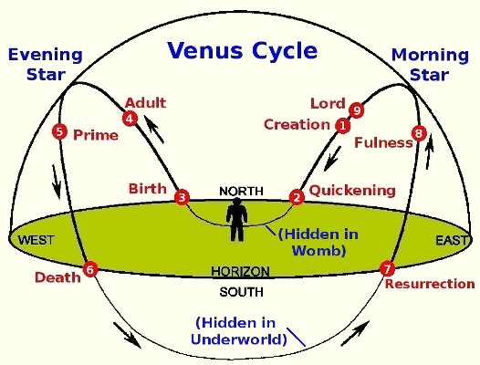 Fig. 2. Venus spends equal time as Evening Star and Morning Star. Its life cycle begins at (1) Creation, and then enters the dark womb as it sets with the sun below the horizon at (2) Quickening. It lives life as the Evening Star: Born rising at (3), becoming an Adult at (4), rising highest at Prime (5), with Death at setting (6). It then Resurrects (7), is brightest as morning star at Fulness (8), and finally becomes Lord (9).