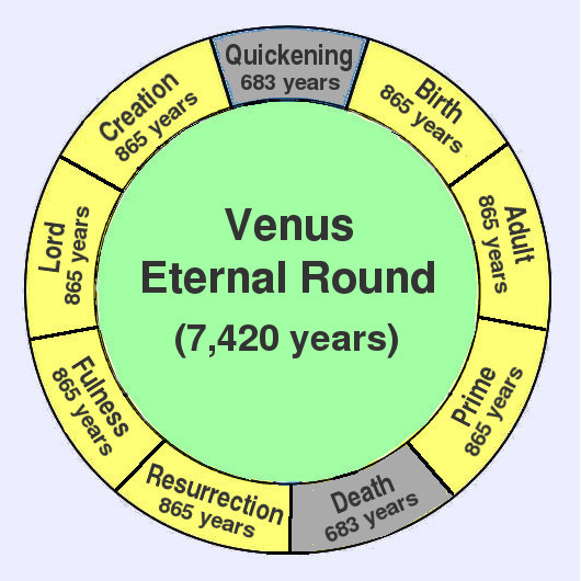 Again following the fractal pattern of nine phases to a unit, these Venus Great Rounds are also grouped into sets of nine to form what could be called "one Round with God, but not with man", to paraphrase D&C 88:44 quoted above. That revelation did not refer to only the sun and moon, as in the Jubilee Calendar, but to all of the planets. This huge round which covers all of our history shall be called the Venus Eternal Round, in the sense that "eternal" can mean "God-like" (D&C 19:10-12) because all history is like one Venus Cycle with God.