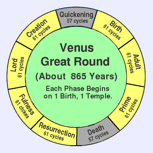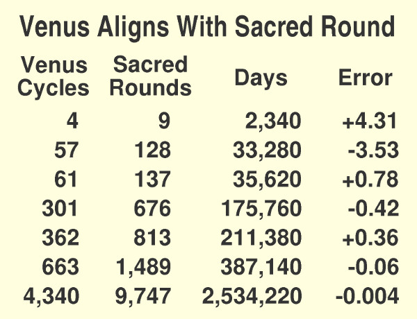 From that point in time, periods of 61 or 57 Venus cycles begin to be counted, which will continue all through history in the patterns now to be described. In order to facilitate referring to these periods when the Venus Cycle comes out even in Sacred Rounds, these two intervals shall be called "Venus Rounds" in my work, referring to either the period of 61 or 57 Venus cycles. The "long" (61-cycle) Venus Round consists of 35,620 days, which is 61 Venus cycles of 585 days, corrected by skipping five 13-day trecenas at various places. The "short" Venus Round (57-cycle) comprises 33,280 days, which includes skipping the five trecenas.[11] One long Venus Round of 61 Venus Cycles is nearly a century, lasting about 97.5 years.