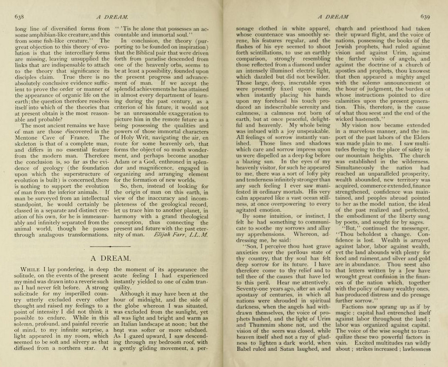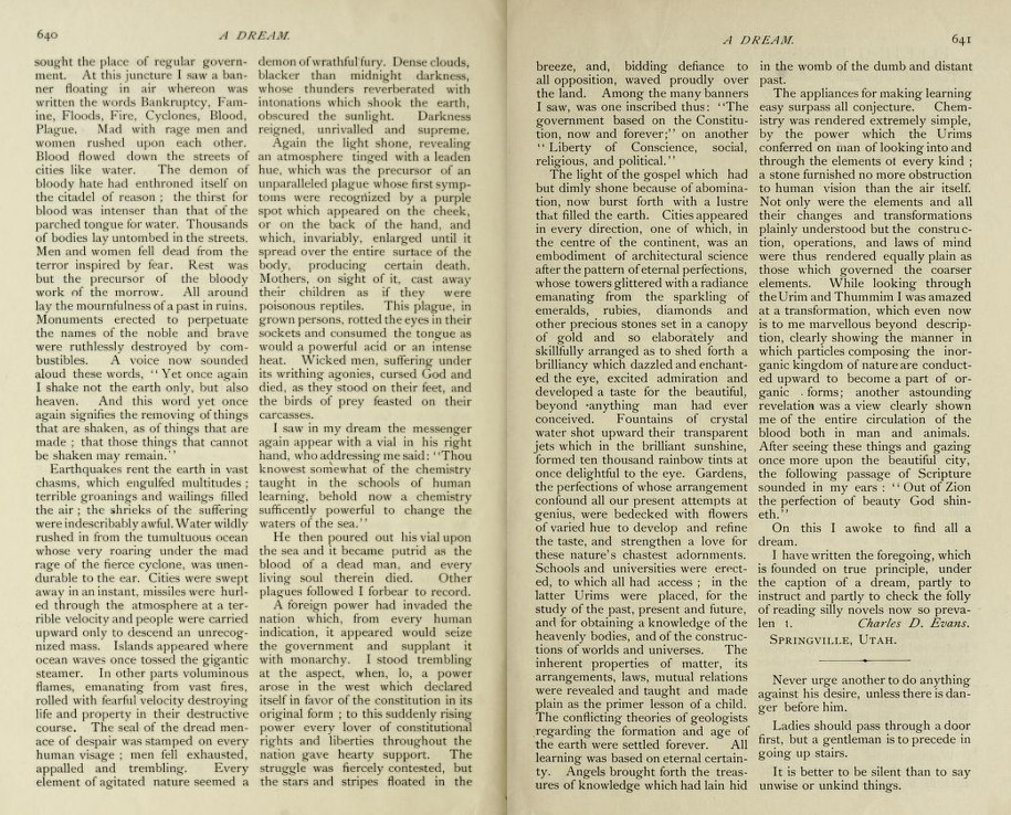 2. Kraut, Ogden, Visions of the Latter Days (Salt Lake City: Pioneer Press, 1983), pp. 57-64; available at visionsandtribulation.blogspot.com/p/the-vision-of-charles-d-evans-1893.html. Those versions are edited from the published article, "A Dream", The Contributor, vol. 15 (Aug 1894), pp 638-641, which was used in this article and is online at archive.org/details/contributor1510eng/page/638/mode/2up, and also available here and here. Thanks to Russell Anderson for finding the original for me to publish here. Some accounts say the vision date was 1893, but the vision refers to Angel Moroni's 1823 appearance as having been 71 years prior to the vision, so it was given in 1894.