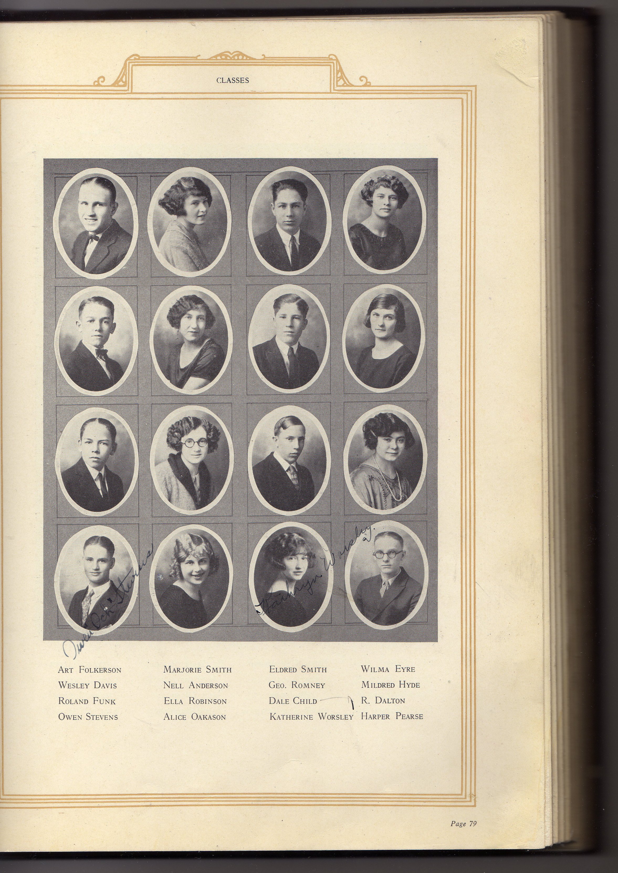 The photos at right are from one column on page 79 of Mother's 1924 LDS High School yearbook section for juniors. My mother, Kathryn Worsley Pratt, is at the bottom of the page. The fellow at the top of the column is Eldred G. Smith, a direct descendant of Hyrum Smith, who later became the Presiding Patriarch of the Church, which in the early days was the highest Church position (D&C 124:124). He presided over all of the patriarchs in the Church and gave patriarchal blessings in the Church Office Building to those from outside organized stakes who came to him. He always spoke in LDS General Conference until the position of Church Patriarch was eliminated in 1979, after which he continued to given blessings until he passed away at age 106 in 2013. I attended his funeral. Just below his picture is that of George W. Romney who became president of American Motors, then governor of Michigan, and was the Republican presidential candidate for the 1968 election. He was also the father of Mitt Romney who likewise became the Republican presidential candidate for 2012.