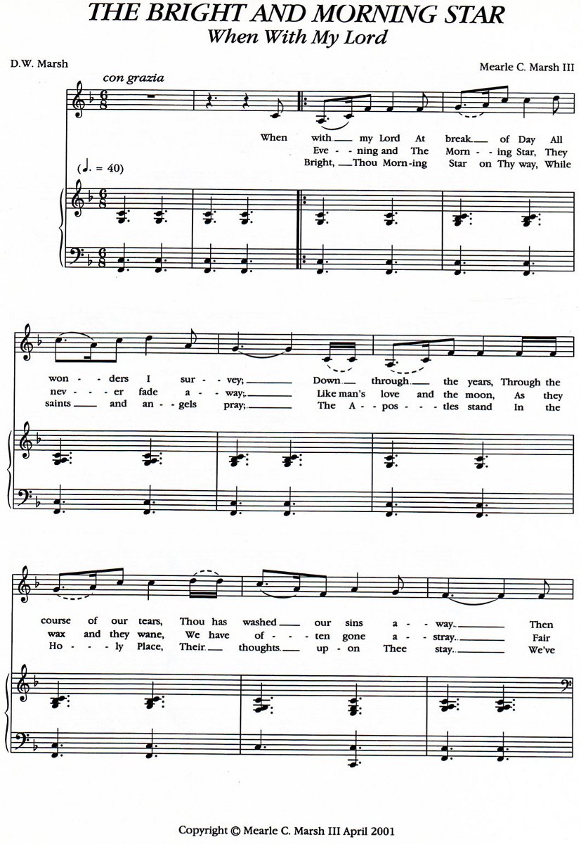 Each attendee (see list below) receive an autographed souvenir program (see below), numbered with their birth date on the Sacred Round. It was an event to remember. Special thanks go to Alan and Karen Ashton who not only graciously allowed us to use their facilities, but also had the waterfalls turned on to complete the natural beauty of the location. Special thanks also go to D. W. Marsh and Merle C. Marsh III for composing a special hymn just for this occasion: "The Bright and Morning Star" (see below).