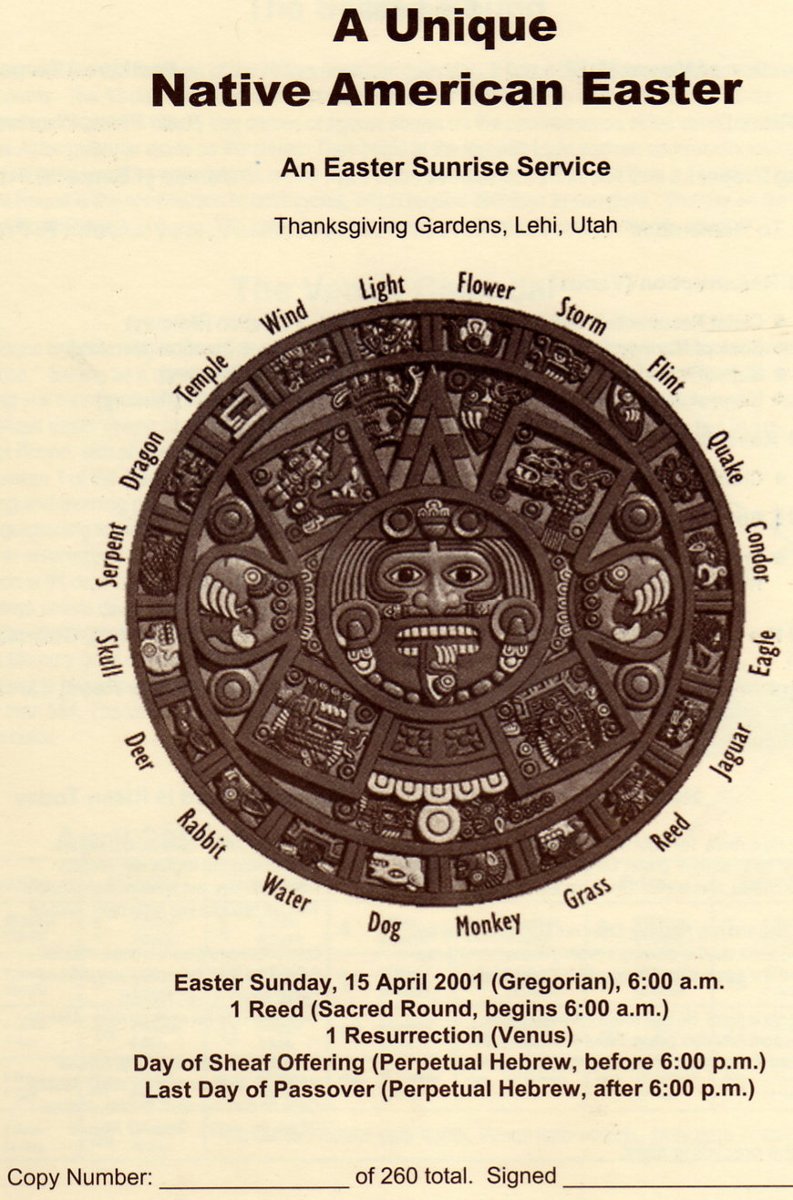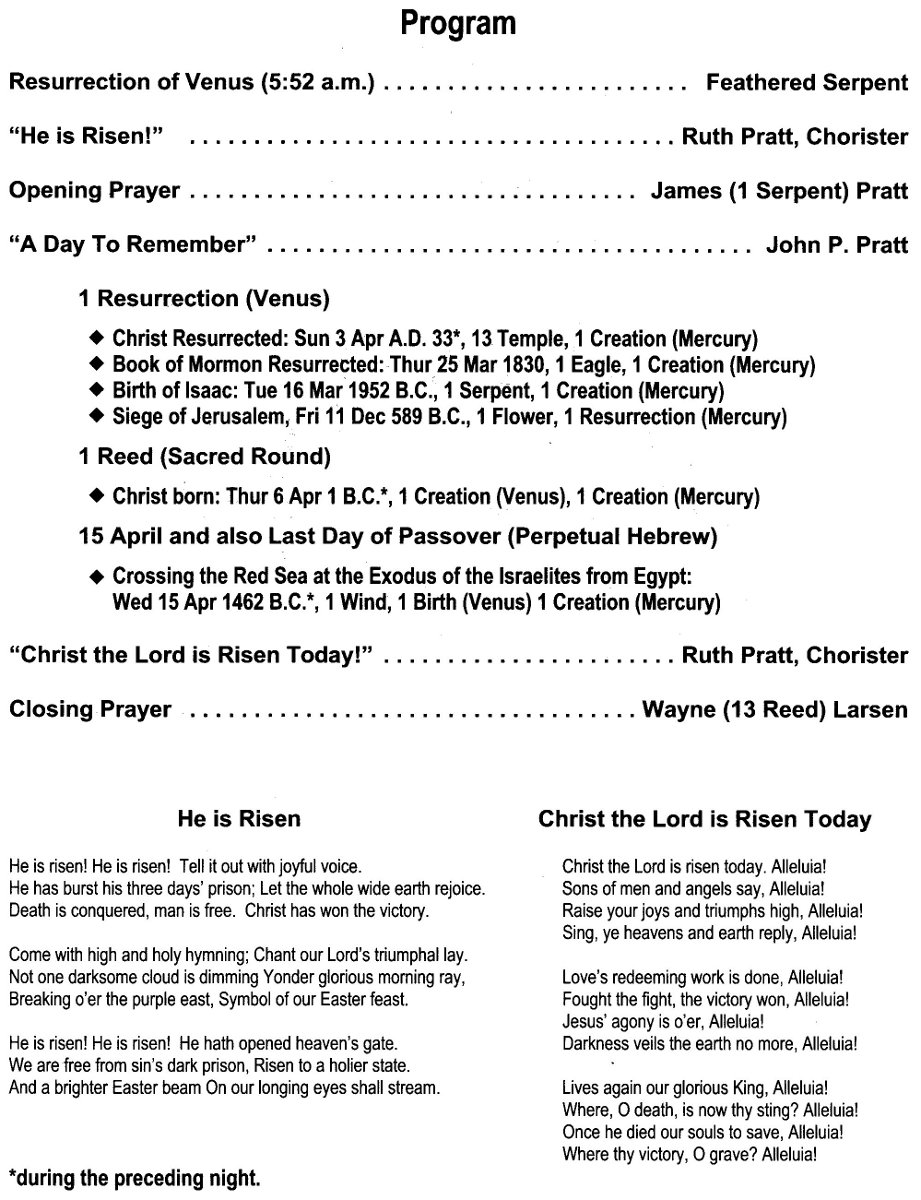 An Easter Venus Resurrection program to celebrate the rising of Venus on the day 1 Resurrection (Venus) and 1 Reed (Sacred Round) was held at Thanksgiving Point, Lehi, Utah. At the time of this event, it was known only that 1 Reed was the birth date of Jesus Christ, but later it was discovered that that is also the day which represents resurrection on the Sacred Round. Those two dates only both fall on Easter Sunday once in the 7,000 years since Adam, so it truly seemed to be an event worth celebrating. The weather was totally clear and Venus was observed to rise exactly at 5:52 a.m. (as printed on the program) through the notch atop Mt. Timpanogos. It was breathtaking to see it burst brightly into view right on the end of our countdown.