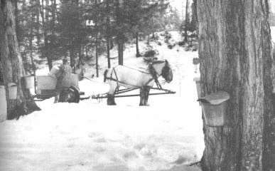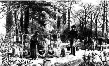 Sugar makers in 1820 gathered maple sap in wooden buckets. They boiled the sap in a series of iron kettles which hung over an open fire. At one end, where the fire was highest, water boiled off. As the sap thickened into syrup they ladled it into the second kettle, where the fire was lower, and added fresh sap to the first kettle. In this way, they removed the water without burning the sugar. In the last kettle they stirred liquid sugar until it crystallized and then poured it into wooden molds to form blocks. The early settlers considered maple sugar a wonder of the New World.