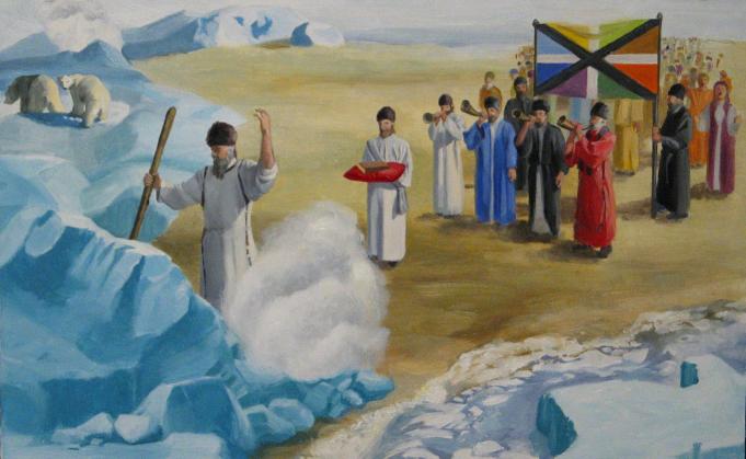 - "The Northern Tribes Return," an oil painting by Mary Pratt Parker, designed by the author for this article. The leading prophet who smites the rocks and ice wears white, symbolic of Ephraim, as does the second man who carries one of their treasures, their scriptures. A steamy mist rises from the melting ice. The four men sounding the trump are dressed in the colors of the four winds (and four principal tribes of Israel), whereas both men carrying the banner wear black, symbolizing Dan. Dan is the leader of the tribes of the north (Num. 2:25), so black is the color of the prominent St. Andrew's cross on the flag, and also the principal color of the hats. The white cross on the flag symbolizes Ephraim and Manasseh, and the other colors represent the other tribes as discussed in last month's article. (See Pratt, John P., "Twelve Sons, Twelve Stones," Meridian Magazine, 3 Aug 2005.) Those colors are yellow-green (Zebulon), tan (Issachar), orange (Gad), green (Simeon), purple (Levi), royal blue (Reuben), light blue (Naphtali) and yellow (Asher). The multitudes who follow are singing songs of everlasting joy.
