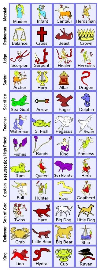 What is the symbolism of the Raven? That sign is found in the paradise row. To me it represents any of the dead who are in the spirit prison. We saw in an earlier article that Noah's raven, who went "to and fro in the earth" was identified with Satan who did likewise (Job 1:7).[20] But, being in paradise suggests that the Raven can also represent the righteous dead. The Raven is shown attacking the Hydra, implying that he is on the righteous side of that battle. And what of the Cup which also is shown on the back of the Hydra? As it last month's article, it could represent both the Cup of the wrath of God poured out on the Hydra, and also the harlot (Hare) who rides the back of that monster.