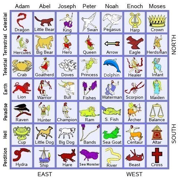 The highest level of heaven, the celestial kingdom, is represented by the constellations nearest the center of the upper circle (the north ecliptic pole), the terrestrial by those near the middle, and the telestial by those nearest the zodiac figures. Similarly in the lower circle, paradise is represented by the figures just below the zodiac, whereas those nearest the center of the circle such as the Centaur and the Cross represent perdition. Now let us look at the roles of the seven angels in each of these areas at different times.