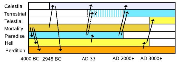 Figure 2 illustrates the various kingdoms and when each is populated. Since Adam, there have been people on earth, in paradise, in hell and in perdition. About 2948 BC Enoch's people became so righteous, living the law of the highest heaven, that their whole city was taken up into heaven (Moses 7:21) and began to populate that area. By that I do not understand that they were in the presence of God because their probationary period was not over, but rather they were in a place which became a temporary celestial kingdom. The Book of Enoch implies that later some of them knowingly chose to sin and became "fallen angels," and were relocated to suffer in the depths of perdition until the end of the world (Enoch 12:1-14:7).