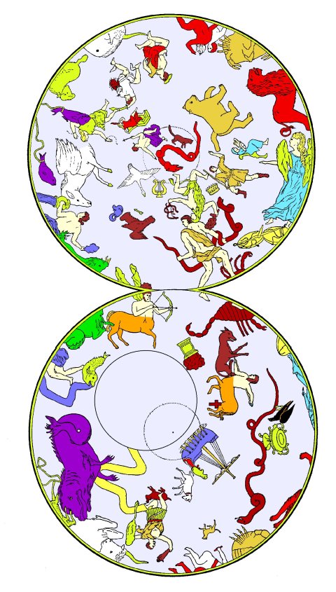 Now for the logical extension of this concept. Even as the Savior referred to the general locations of heaven and hell, so also do the stars. All of the constellations above (north of) the zodiac represent heaven, and all of the constellations below (south of) the zodiac represent the underworld. Thus, in Figure 3, "heaven" is the upper hemisphere of sky north of the zodiac constellations, and "hell" is the underworld of constellations shown in the bottom circle. Notice that the upper circle contains many flying creatures such a Swan, Eagle, Flying Horse, an Arrow, and even a Dolphin which jumps out of the sea and "flies." On the other hand (left hand), the lower circle is filled with things below the earth, often represented by the sea, such as the Sea Monster, Water Serpent, River, Ship, etc.