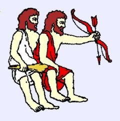 The Twins. In this context, the Twins are two separate constellations. In the sky, one is clearly above the other, and in the table of 49, the one in Abel's column, the Warrior, is on earth, while the one in Joseph's column is in Paradise. In mythology, the Twins are Castor and Pollux, and there are bright stars with those names at the head of each twin. Castor was a warrior, being an expert swordsman, and Pollux was a champion boxer, so I have chosen the names Warrior and Champion for English translations of their symbolism.[14]