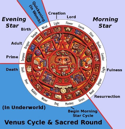There is an important correspondence of the Venus Calendar to the Sacred Round of Native Americans. First of all, both the Evening and Morning cycles are always 260 days in length, the same length as the Sacred Round. Moreover, the Sacred Round includes a cycle of 20 days which represent the steps in life. Most of those steps occur after death, with only three from birth to death! On the other hand, the Aztecs taught that the cycles of Venus represented the life of their god Quetzalcoatl, who was born, was cut off in life at his prime (represented by the Evening Star), descended into the underworld, conquered death, and then rose as a bright Morning Star at his resurrection. It was that legend that got me started in this research when it was discovered that the planet Venus was indeed rising as a bright Morning Star on the morning described in the New Testament as the date of Jesus' resurrection. The point here is that because both the cycles of Venus and the Sacred Round describes steps of life, if they are founded on true principles, then there should be a correspondence of days between them.