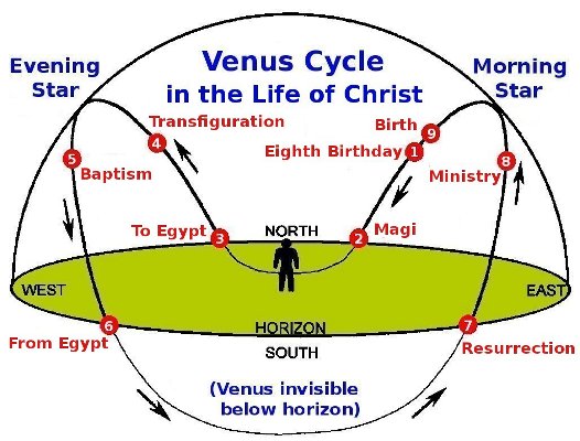 Until now, my articles have discussed eight orbital points in the Venus cycle, with days when Venus is at those locations being considered "holy days". These days begin and end "phases" in the "life cycle" of Venus, such as birth, death, and resurrection. There are two consecutive holy days at each orbital point, being the last day of one phase and the first day of the next. The name of the phase, such as "Birth", usually refers to the entire phase. If the holy day is meant, it is usually stated "1 Birth", meaning the first day of the Birth phase or "0 Birth", meaning the last day of the preceding phase. Zero is used so that one does not have to remember the number of the last day of each phase.