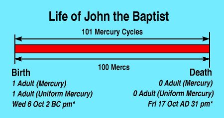 The lifespan of John the Baptist has already been discussed in detail as being amazing in that it is an exact number of several sacred cycles.[8] It was exactly 100 mercs, being 11,700 days. That is 100 Uniform Mercury Cycles, 101 Mercury Cycles, 20 Uniform Venus Cycles, 45 Sacred Rounds and 15 Mars Cycles.