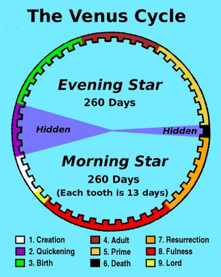 Venus has a 585-day cycle, divided into 9 phases at certain key orbital points as shown in Figure 3. These phases represent steps in the "life cycle" of Venus. For example, rising in the west as an evening star represents birth, and setting there 260 days later represents death. Similarly, rising in the east as a morning star represents resurrection. More details about the pattern of the Venus Calendar can be found in previous articles.[5]
