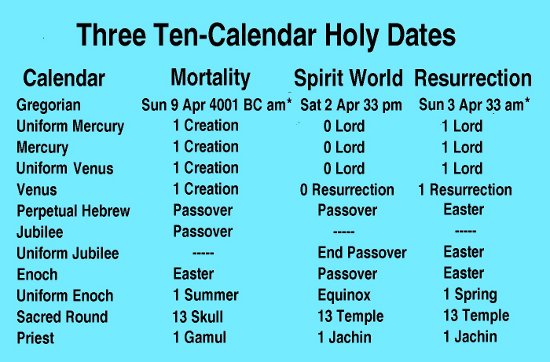 In the recent article which summarized how several of the events in Christ's life were holy on eight days, it was noted that the only other such eight-holy-day date was that of the Beginning of Mortality.[3] But with the discovery of the Uniform Mercury Calendar and the new correlation of the Uniform Venus Calendar being such that Sun 9 Apr 4001 BC am* falls on 1 Creation, now that date is holy on ten of the eleven sacred calendars. The asterisk in the date means before 6 a.m.