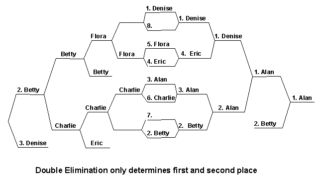 This problem of determining second place is well known, which is what led to the development of the Double Elimination tournament. It is essentially two single elimination tournaments back to back. That is, all who have lost one match are entered into another single elimination to determine who is second place. That always works correctly, but it is important to not that it fails about half the time to correctly determine third place. Looking at the next illustration, we see that Betty is awarded second place, but her last match in the loser's tournament was with Denise, who would be given third place. But Charlie is really the third place contestant; he just didn't get a chance to prove it by playing Denise. Thus, the Double Elimination tournament only determines the top two places.