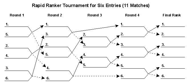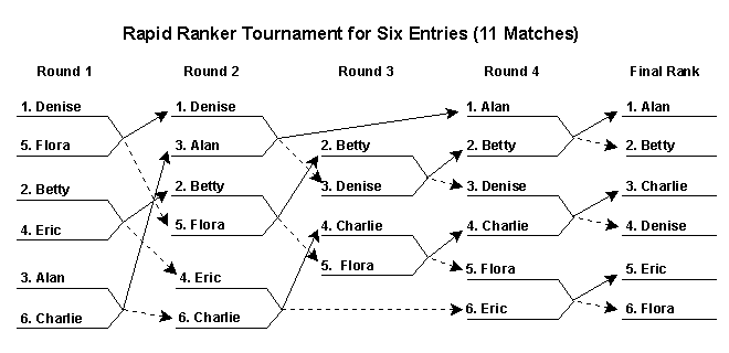 Number Ranked. The Single Elimination really only determines first place, and even for that result one must assume that if contestant A can beat B, and B can beat C, then A can defeat C and hence they do not need to play. That is true in some sports more than others. In table tennis, for example, where there are many styles and varied equipment allowed, it is often the case that C can nearly always defeat A. The Round Robin determines all six rankings perfectly, given that there is a way to break the three-way tie that occurs when C does indeed defeat A. The Double Elimination tournament only determines first and second place, unless seeded well in which case the bronze medal usually goes to the right entrant. The power of the Rapid Ranker is that ranks all entries very well, provided there is an approximate initial ranking (seeding) available. It is not always perfect, but in about the same number of matches as the Double Elimination, it usually determines third place equally well, along with all of the other places.