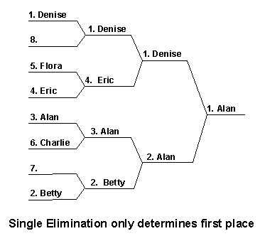 Let's suppose there are six contestants whose ability happens to coincide with the alphabetic order of their names. That is, suppose Alan can beat Betty, who can always defeat Charlie, who can beat Denise, who can beat Eric, who can beat Flora. Suppose that Charlie and Alan have improved a lot since the preliminary ranking was done, and that Denise is overrated. Let's say the pre-tournament ranking is 1) Denise, 2) Betty, 3) Alan, 4) Eric, 5) Flora and 6) Charlie. Suppose they play a Single Elimination tournament, seeded in that order. As can be seen from the illustration, Alan, who is best will win. That will be true no matter what position he starts from, so the Single Elimination correctly picks the top contestant, even if poorly seeded, or not seeded at all. But notice that it is Denise who would be given the second place trophy because she played Alan in the championship match. But she does not deserve the trophy because she is only the fourth best contestant.