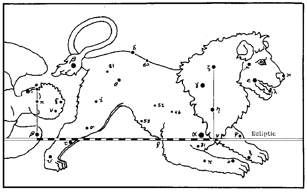 11. Cancer. The boundaries are those of Gemini and Leo on either side. The sidereal sector boundaries of Leo and Virgo are each marked by a three-star line nearly perpendicular to the ecliptic. The two lines are separated by exactly 30°. All 27 stars in Leo listed by Ptolemy are shown as he described.