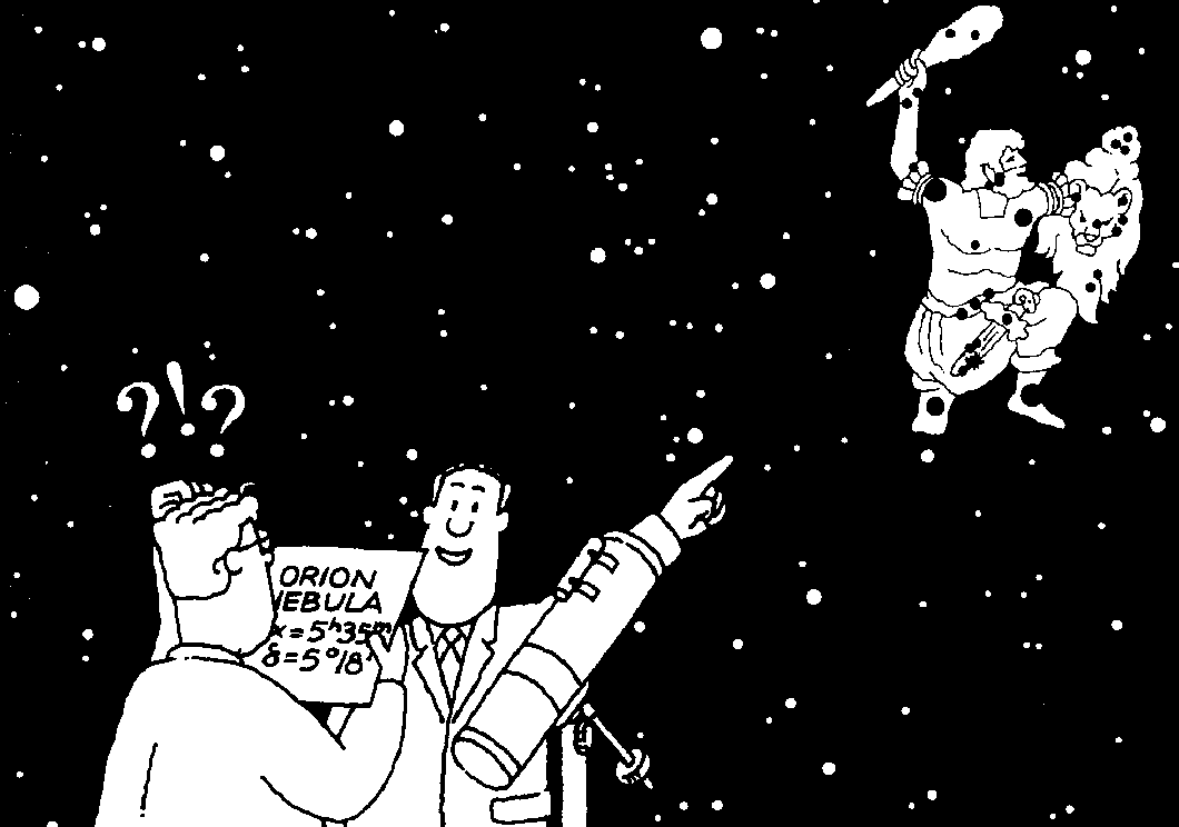 Constellations. One enduring celestial map which does not suffer from precession is the set of constellation figures. One specific star can often be singled out from the multitude by simply referring to its location in the figure, without need for numerical coordinates. When familiar with the constellations, the two words "Orion's sword" can be sufficient to locate the Great Nebula.
