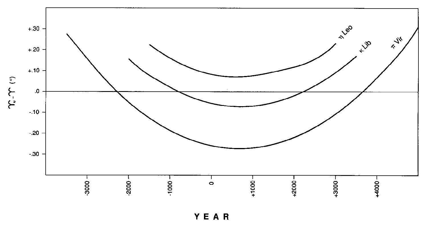 Combining this average rate with the position of a uniform equinox Vu at 0° Aries (= 30° Psc) at the mean equinox of the year 0 would lead to a very simple equation Vu = 30° Psc - T/(72 yr/°), where T is measured in tropical years from that time. How well this equation approximates the position of the mean vernal equinox depends on the position of 0° Aries, and hence on the choice of the origin. Figure 3 compares three low-proper-motion candidates for origin which best fulfill this requirement. It is seen that Kappa Lib would be the best choice for "short term" precessional effects because it approximates the mean equinox to within ±.07° for the period 1400 to +2800, and is currently within .02°. While Eta Leo could also be used as a short term choice, it suffers from never being more accurate than .07°. On the other hand, the choice of either Eta Leo or Pi Vir seems acceptable for longer terms because they stay within a maximum error of only ±.27° throughout the period -3400 to +4800.