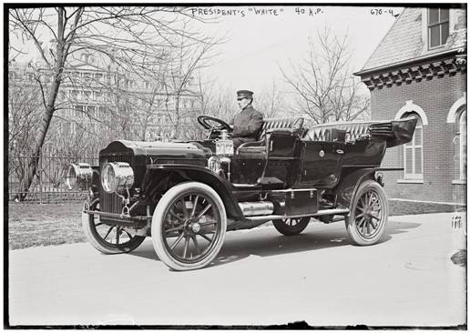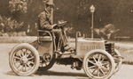 A: In 1902, in a Baker Electric streamliner racer which crashed at 100 mph. on Staten Island.