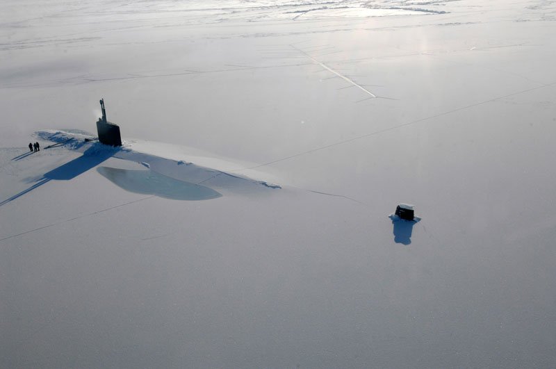 A SUBMARINE SURFACES THROUGH ARCTIC ICE