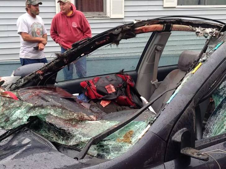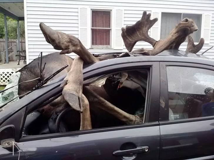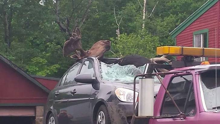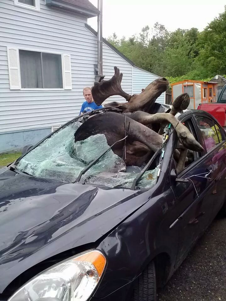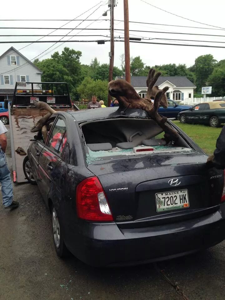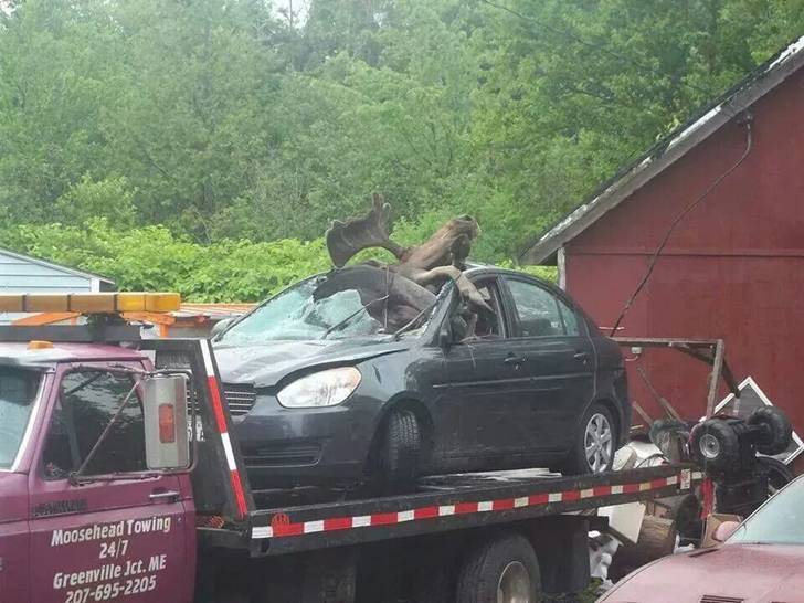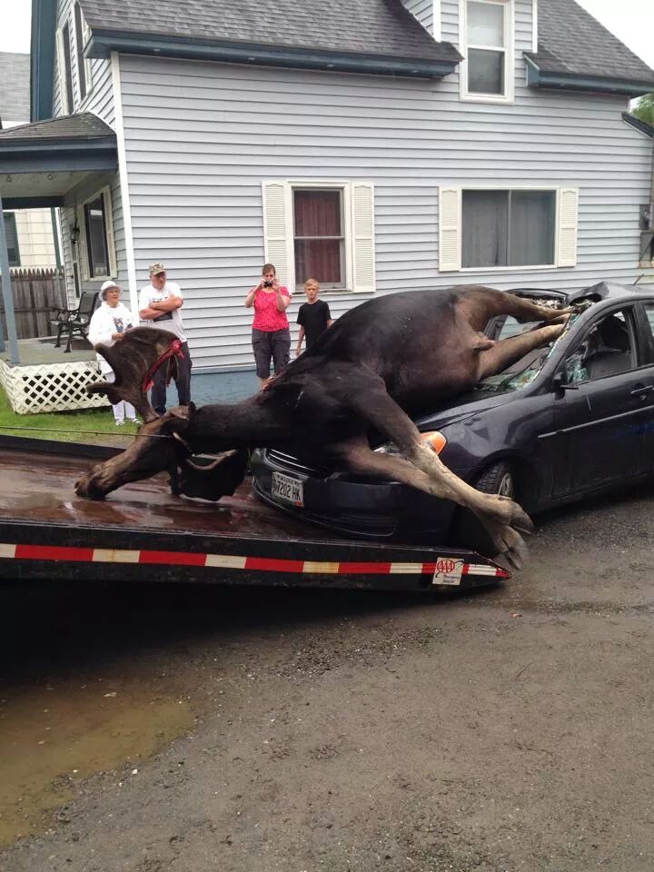 Moose accident near Greenville Maine, July 4 weekend 2014. Check out the name of the towing company... Woman driver walked away with minor injuries.
