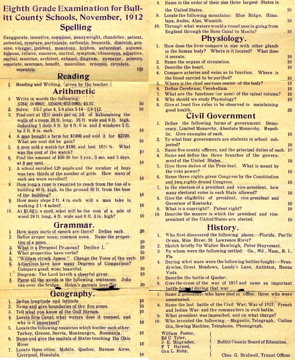 See how well you do on this eighth grade final exam from Kentucky in 1912.