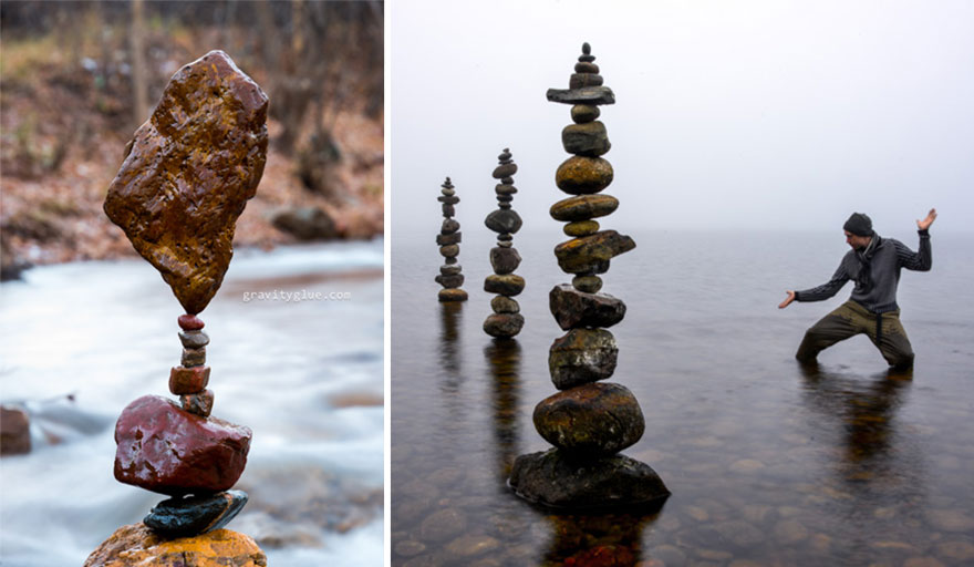 These seemingly impossible structures require intense concentration and meditative focus. Grab spends several minutes nearly frozen, making tiny adjustments until he gets all of the rocks' centers of gravity just right.