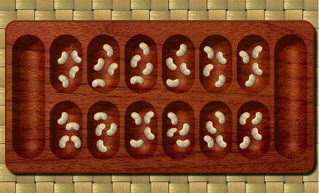 Mancala is the name given to a whole series of games which come from Africa and have been played for over 4,000 years. They have rules simple enough for children to learn, but can challenge adults with the depth of the logic and foresight needed to play well. To me they are so fun that I've decided to add this page to my website. I once tried to write a computer program to play it, but soon learned I don't really know how to play to win consistently myself, much less teach a computer. I'm currently playing an eight-year-old who plays even with me. There are many similar web pages that list variations, but many do not have the simple focus of actually learning how to play these great games. Many do not include enough information to really play, and many have mistakes (please tell me if I do also!). There are hundreds of variations, and I've tried to pick out a few that are clearly related and are the most fun to play.