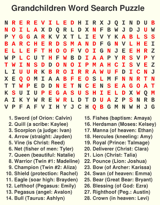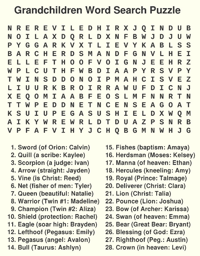 Today my 28th grandchild Levi was born, so to celebrate I posted a word search puzzle here. The is a sacred calendar called the Star Calendar which assigns a star to every day of the year. This puzzle contains all 28 of the English Star names of those grandchildren or the name of the constellation it is in if that star has not been named yet. Extra Credit: As a bonus there are 9 other constellation names also included so that all of the zodiac constellation names are included for a total of 37. (Hint: the Serpent is included as one constellation.)