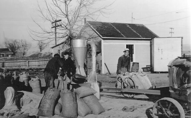 On the corner of Cedar St. & Pole Line Rd. They are making grain mash for the cows and mixing oats, barley etc. for the dairy.