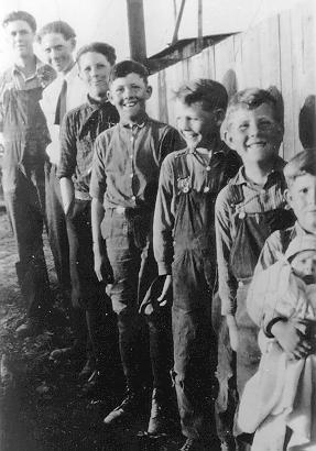 On the dairy farm in Pocatello, Idaho. The oldest to youngest: L-R: Calvin D. Jr., Emerson, Arthur, Ferryle, Winston, Adrian, David, and baby Velma. Ready for chores at Pocatello, Idaho. Seven brothers welcome a new baby sister, Velma.