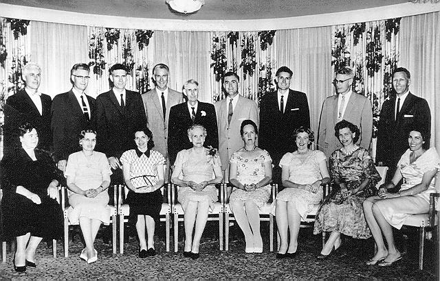 During the 50th wedding anniversary. Back, Left to right: Arthur, Calvin, Adrian, Emerson, Calvin Sr., Ferryle, David, Winston, Clarence Teerlink, Front: L-R: June, Francis, Grace, Achsah, Meriel, Rachel, Louise, and Velma McOmber Teerlink.