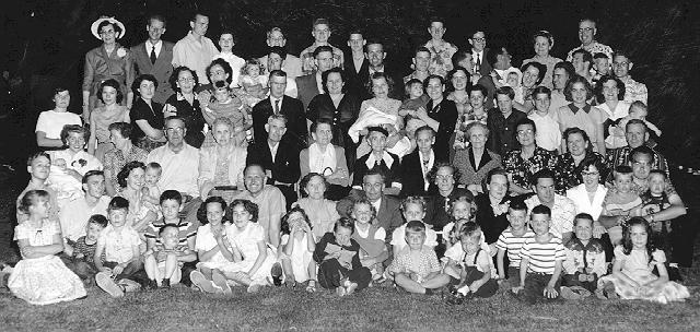 L-R Back: Fay Demille, Lloyd Bryner, ? ? ? ? ? , David F. Stout, ? ? Nettie, and Abraham, Row 4: LuJean Stout, Arlene Elingson, Eunice Stout Bryner, Beulah Limb, David McOmber with Marilyn, Calvin D. McOmber Jr., Don stout, ? ? Baby Larry, Maxine, Nathan, Winston McOmber with son Tyler. Row 3: starting behind CD McOmber Sr: Thurlow Stout, Verda Ray Eyring, Louise McOmber Hortense Richardson, Richard Stout, ? ? (children of Hortense), Merle Stout Budd (end) Row2:Rachel Baird McOmber holding baby Julee, ? , Emerald Stout, Achsah S. McOmber, Calvin D McOmber Sr., Daisie Stout Richardson, Sarah Cox Stout, Henrietta Cox Stout, Madonna Stout Smoot, Genevive, Rosa, & Wayne Stout Row 1: L-R ? ? Jolyn Stout Fitzgerald, ? ? Dewey Stout, Viola Allred Stout, Frank Lyman Stout, Fay Heaton Stout, Florence Heward Oviatt, Dee Oviatt, ? ? , Grant Heward, Larry Barney? The children in the front have not yet been identified except the two twin boys on the right are Brent and Bruce McOmber, sons of Winston and Louise McOmber. (let us try to find the I.D. of the ?) Please help this family picture.